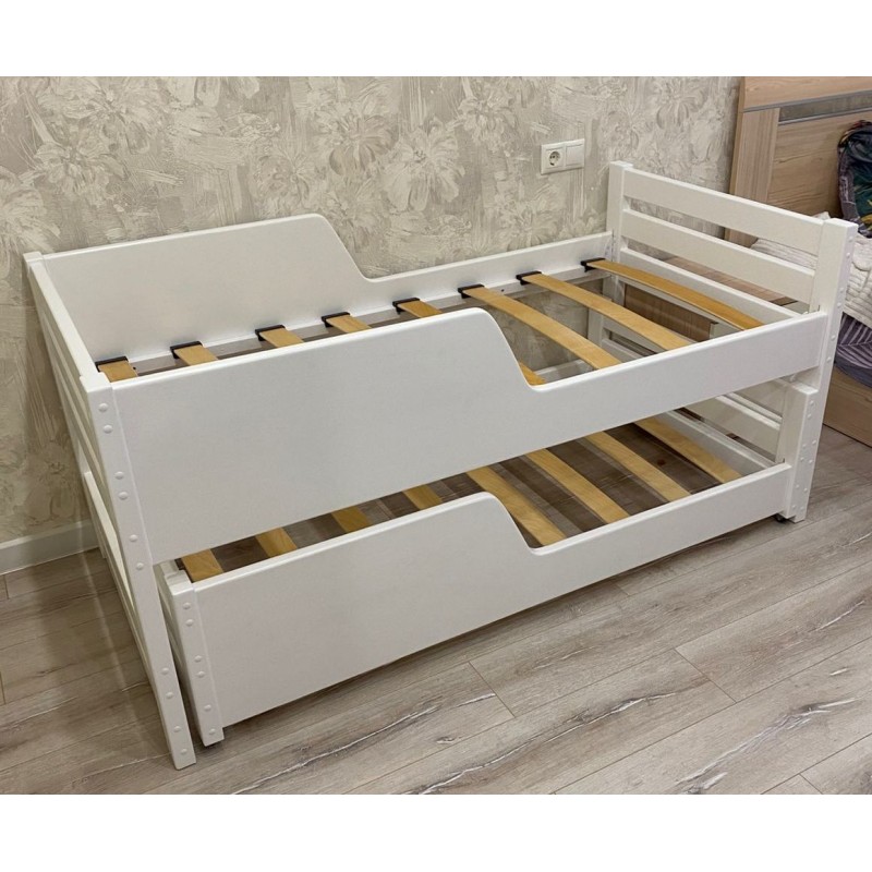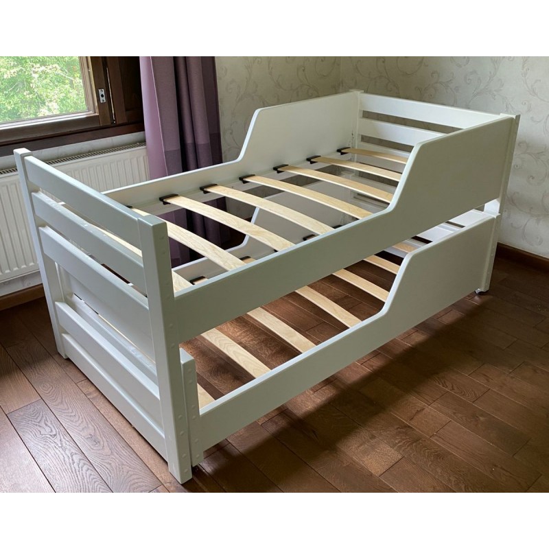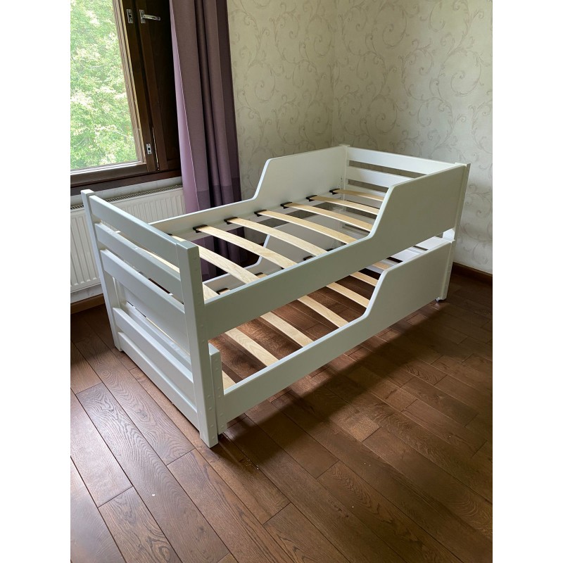 Поставляется в разобранном виде. Дополнительное спальное место полностью выполнено из массива, выкатывается на прямоходных колесиках.