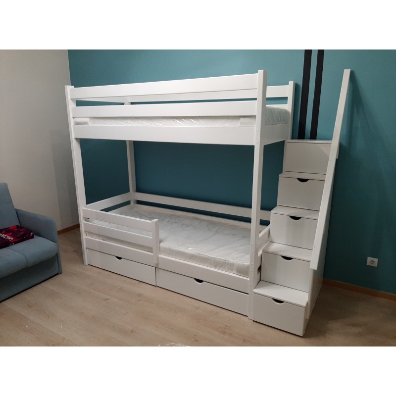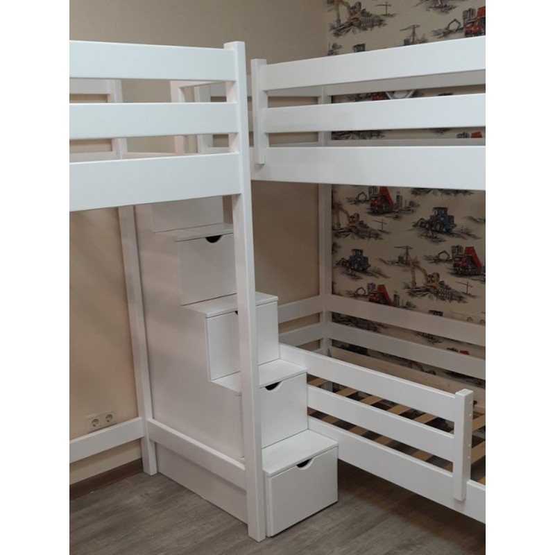 Габариты кровати (длина и ширина) больше спального места на 10 см (без учета лестницы). Стандартная ширина лестницы 40см (без учета перил), выдвижные ящики разной глубины (в стандартном исполнении 5 ступеней/ 4 ящика), верхняя ступень без ящика.