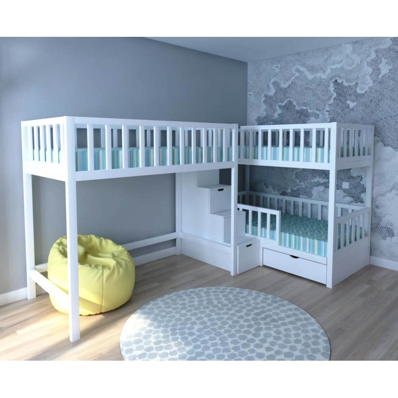 Теги: трехъярусная кровать, трехъярусная с бортиками, кровать для трех детей, кровать для троих детей, двухъярусная угловая, трехместная кровать с лестницей комодом